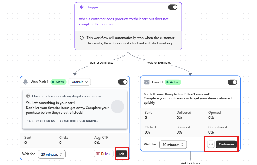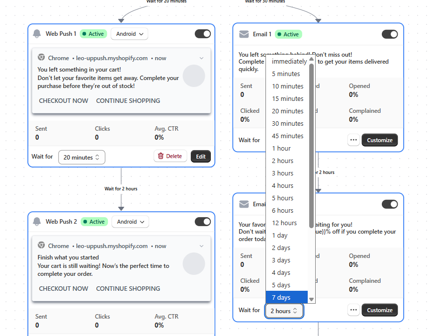 Using the Abandoned Cart Recovery notifications can help you prevent any sales that were lost due to the customer missing it. By dispatching up to three automated notifications as reminders for abandoned carts, you can boost your conversions effortlessly.