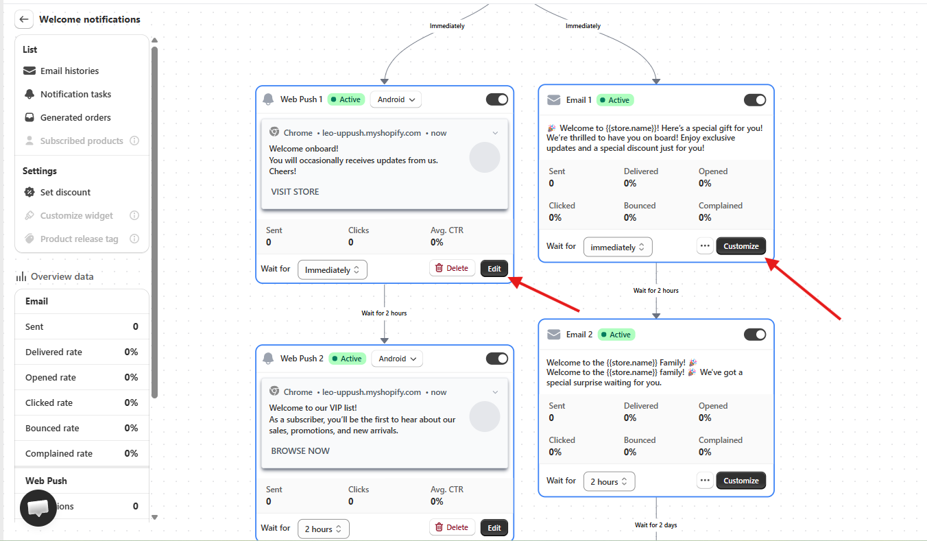 The welcome notification sequence allows you to greet your new subscriber to your Shopify store. You can set up a sequence of notifications to build a personal connection with these subscribers and keep them on engaged for a longer time.