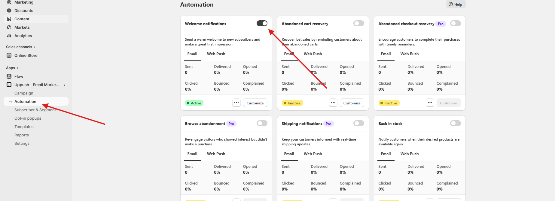 Here's how you can enable welcome notification sequences through the Uppush dashboard: