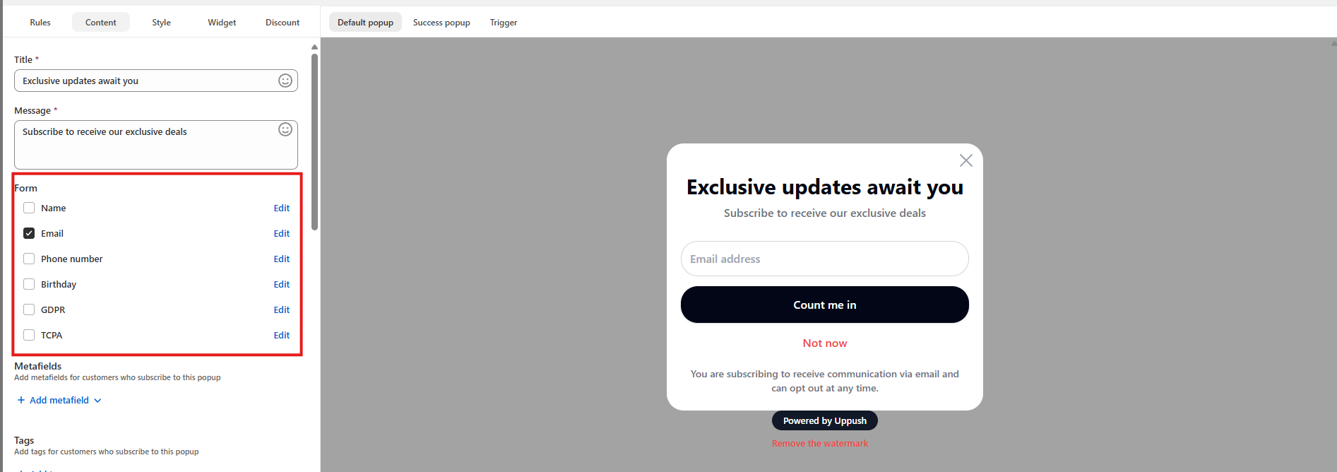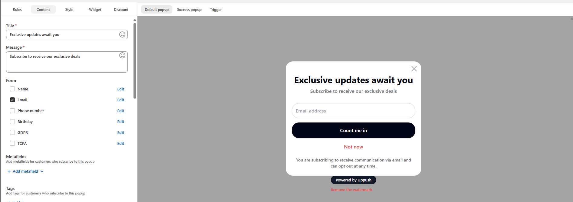 The Content tab in the popup editing feature allows merchants to easily configure pop-ups for collecting email subscriptions. The key elements include: