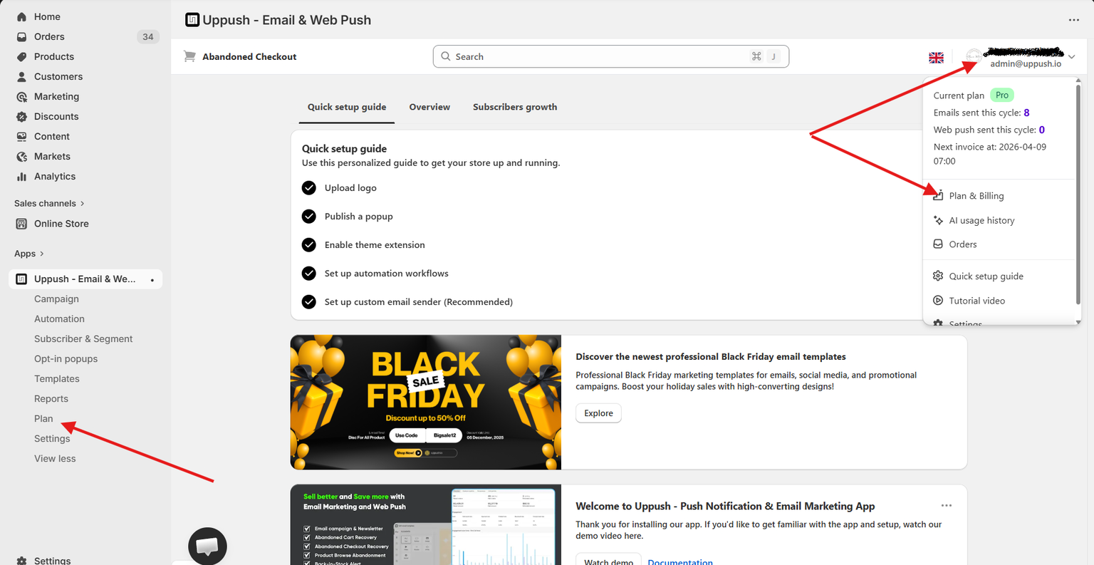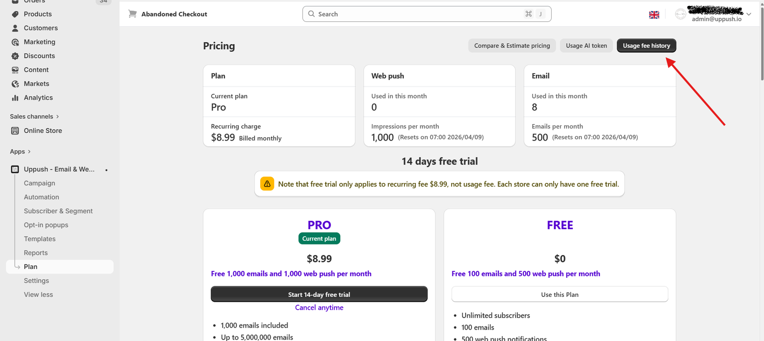 - This page displays your current plan, the number of emails and web push notifications used in the current billing cycle. You can also click Usage fee history to view the number of emails you have used and ththe.