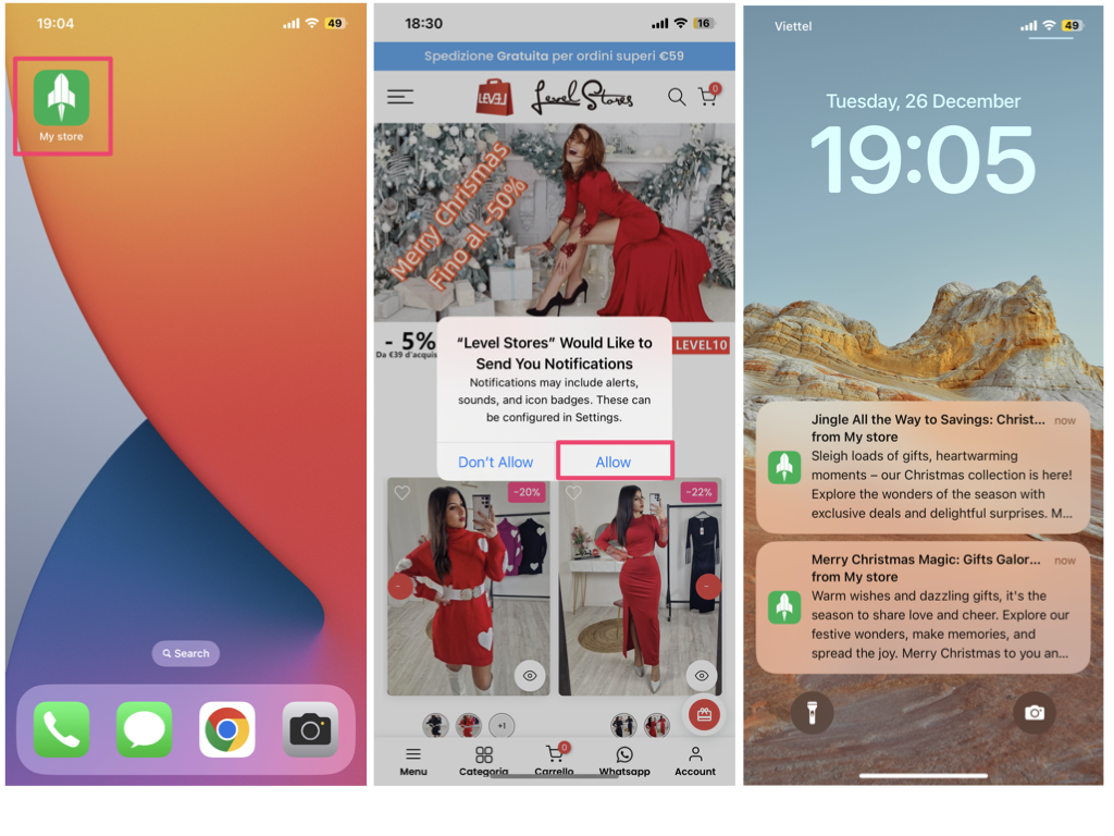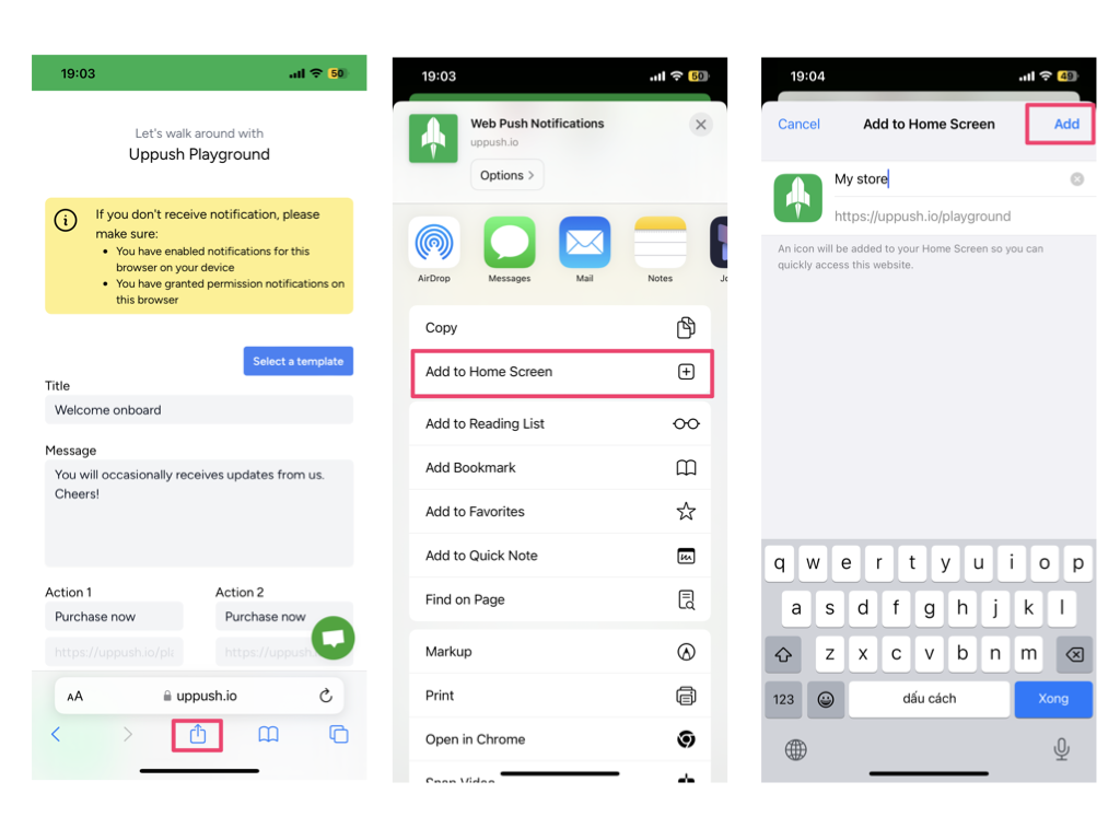 To enable Web Push on iOS, you must add your store to your Home Screen as a mobile app.