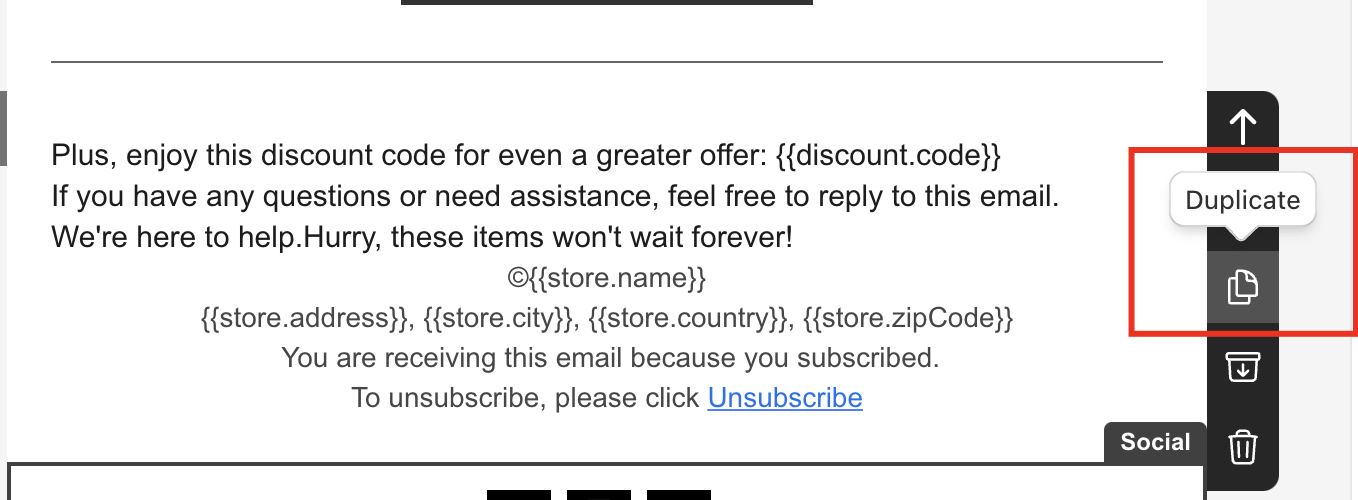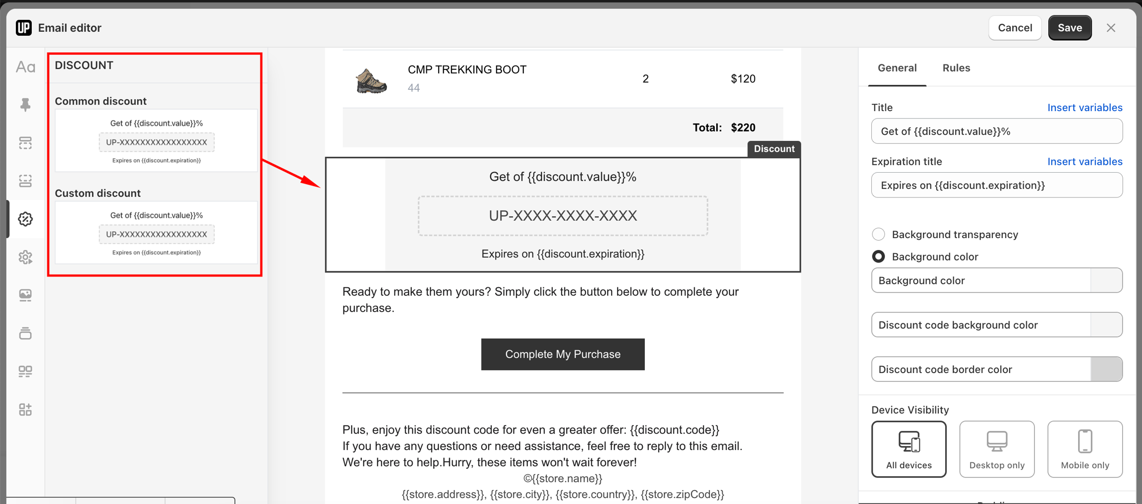 With the discount Item, you can send auto-generated codes for Shopify, or insert the discount code manually inside the email builder.
