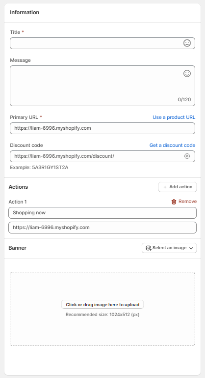 Let's look at the different building blocks of this page: 1. Title: Add a title to your notification to let shoppers know what it's about.