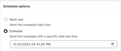 - Schedule: Set a date in the future when you want the campaign to go live. When you select 'Schedule', you will be shown a date picker to select when you want the campaign to start sending.